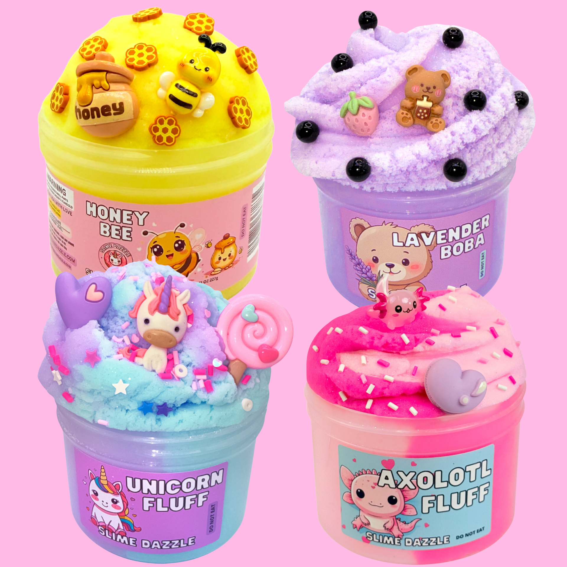 Inside this bundle, you’ll find a variety of beautifully themed slimes, including Honey Bee, Unicorn Fluff, Lavender Boba, and Axolotl Fluff. Each one is uniquely scented and visually appealing, making every jar exciting to open and play with.