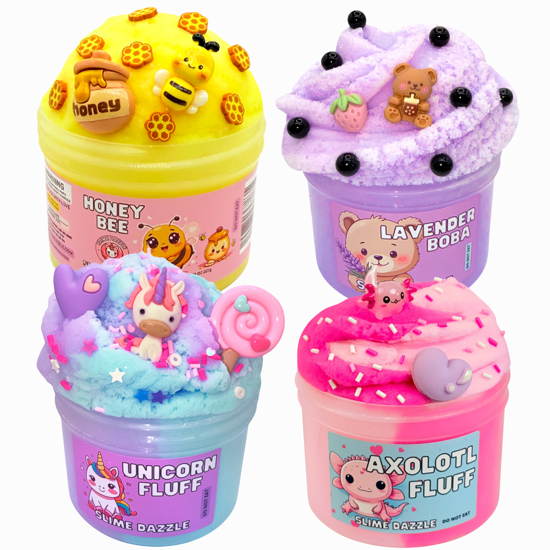 This set includes four large 8 fl oz cloud slimes, each designed to deliver a soft, fluffy, and non-sticky texture that’s perfect for beginners and experienced slime lovers alike. Whether you’re stretching, swirling, or creating satisfying drizzles, each slime offers a calming and fun sensory experience.