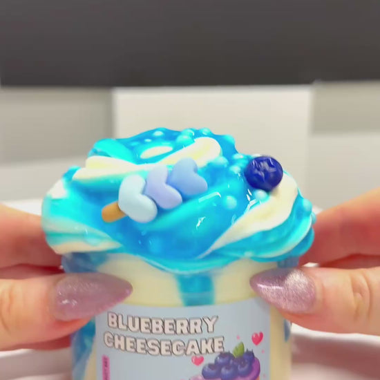 Blueberry Cheesecake is a dreamy DIY floam slime set that combines a smooth butter base with a thick, scented blueberry glaze. Once mixed, it becomes a soft, buttery floam texture perfect for squishes and stretches, scented just like real blueberry cheesecake.