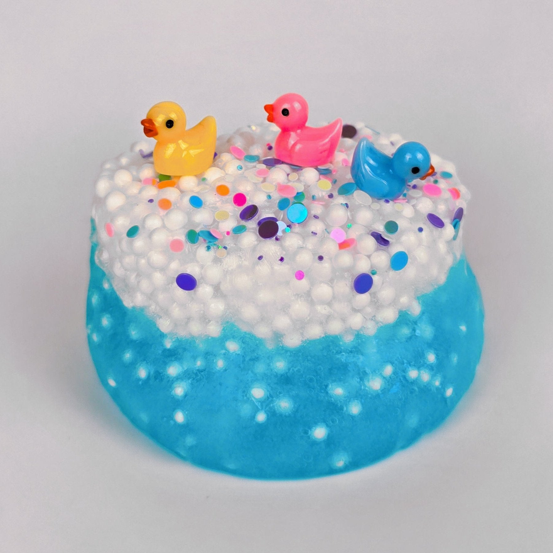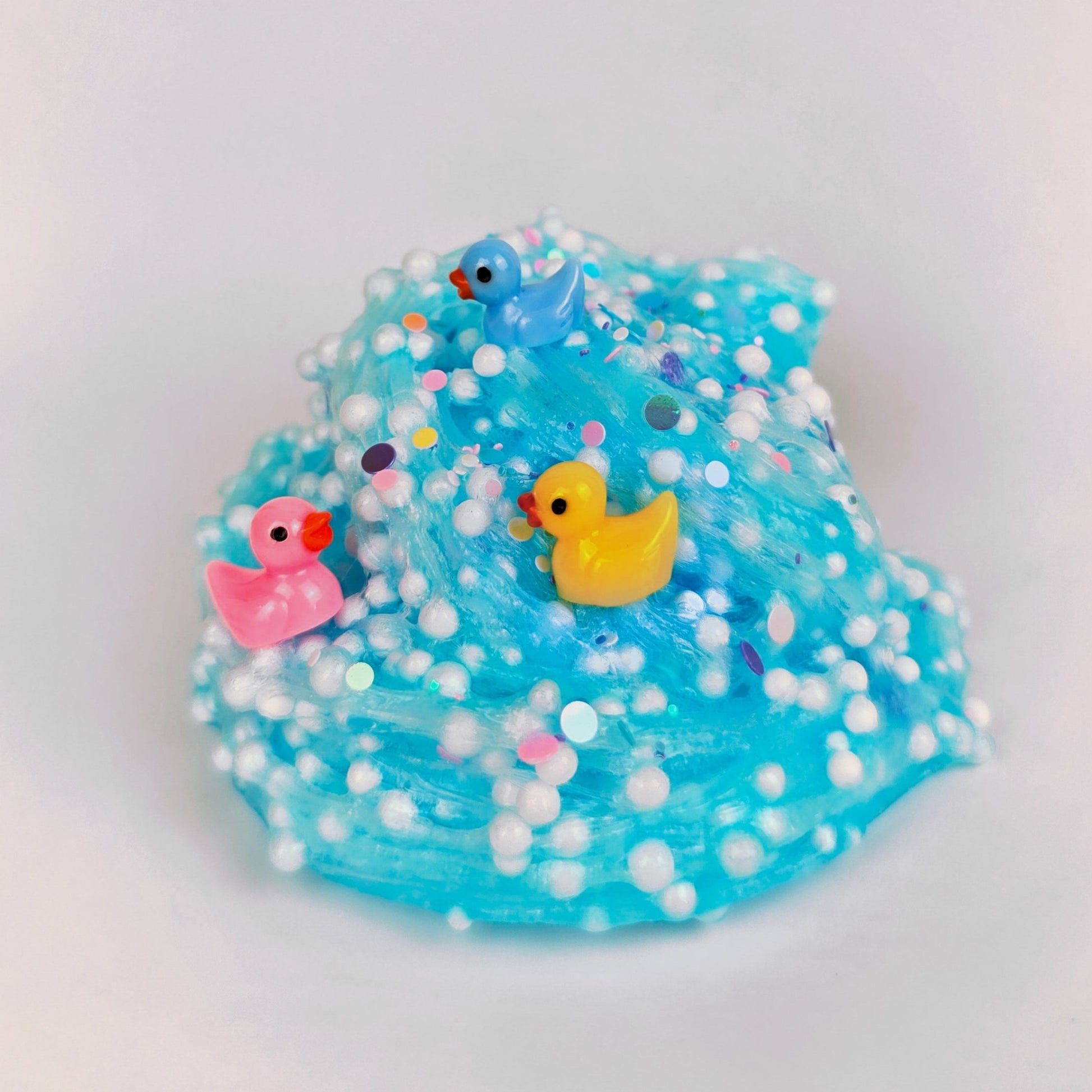 Bubble Bath is a fun and playful clear floam slime loaded with beads and topped with glitter and sprinkles. Scented like classic bubble gum, this slime is perfect for ASMR lovers and features 3 adorable duck charms floating inside. The texture is bubbly, crunchy, and fun to stretch or poke.